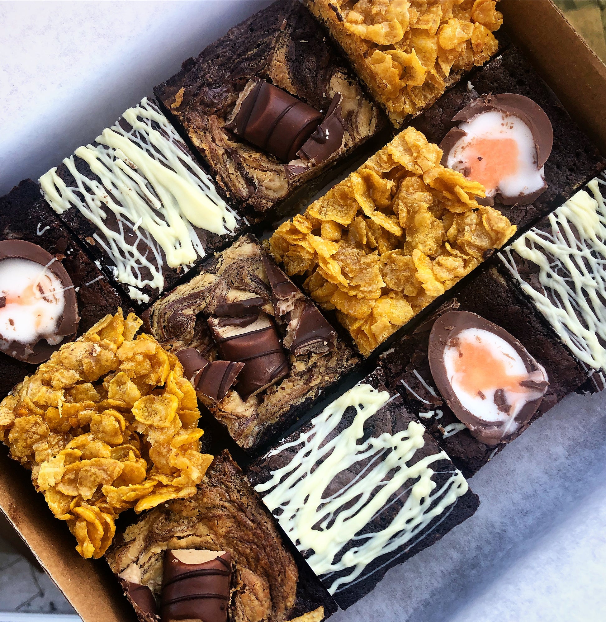 3 or 4 different flavours of Brownies, Blondies and Cookie Dough Bars in a mixed box with ‘Thank You’ toppers randomly chosen from the following: